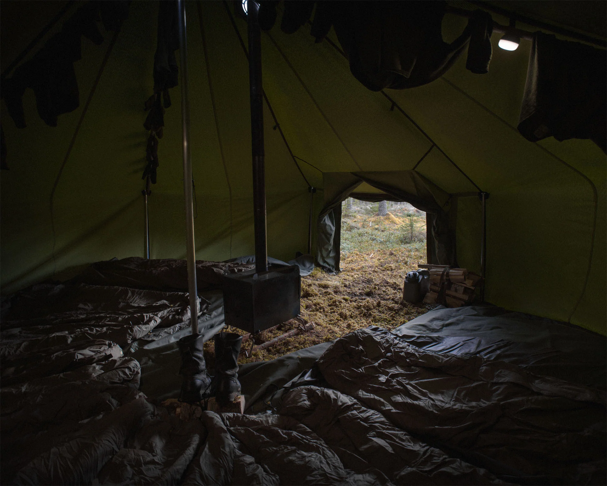 Field camp tent for a maximum of 20 people, stove compatible for 4-season use. 110 cm high walls and 250 high top. Low wall height, best suited for accommodation use.