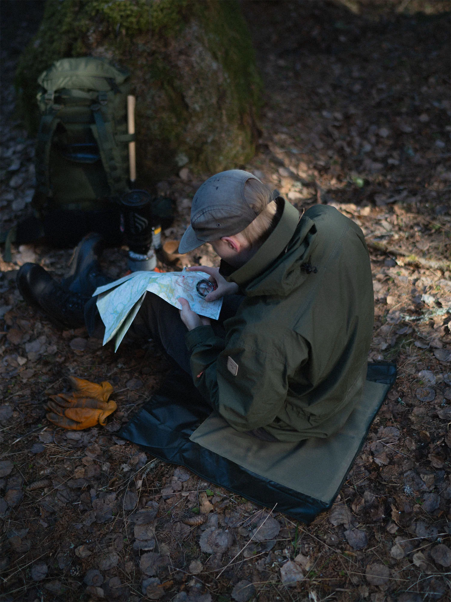 Foldable sitting pad with friction coating and groundsheet-like extensions, similar to our sleeping pad. Folds up and fits into compartments on most of our backpacks. Absolutely fabulous when you need to sit, kneel or work in wet, cold or dirty terrain.